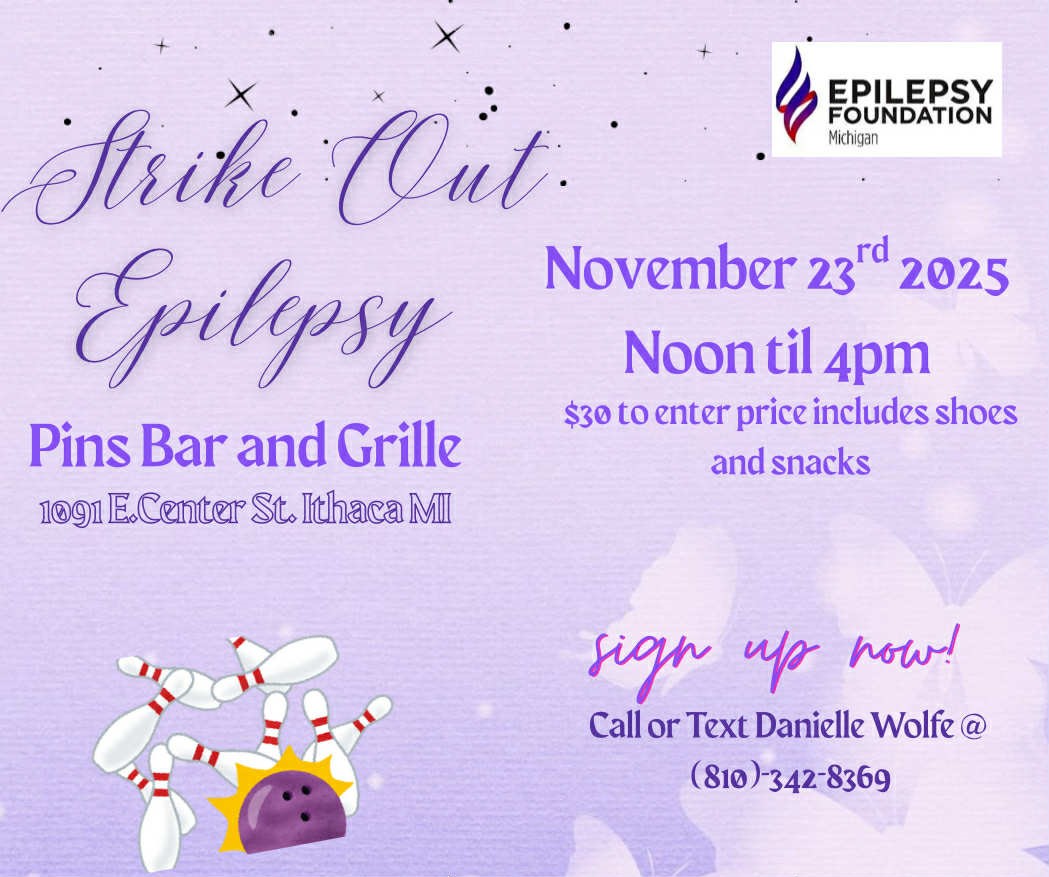 Come Strike Out Epilepsy at the Pins Bar and Grille! Enter for $30 (includes shoes and snacks). Call or text Danielle Wolfe at 810-342-8369 to sign up!