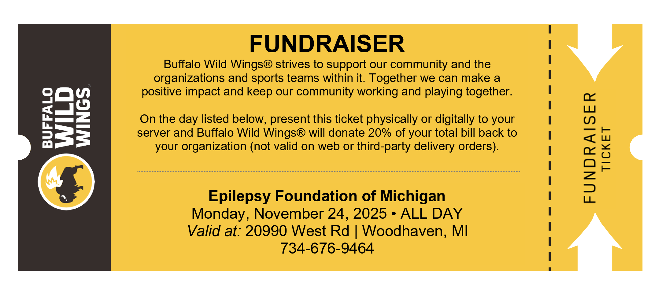 On November 24th from 11 am to 11 pm, present this ticket physically or digitally to your server, and Buffalo Wild Wings® will donate 20% of your total bill back to the Epilepsy Foundation of Michigan (not valid on web or third-party delivery orders).
